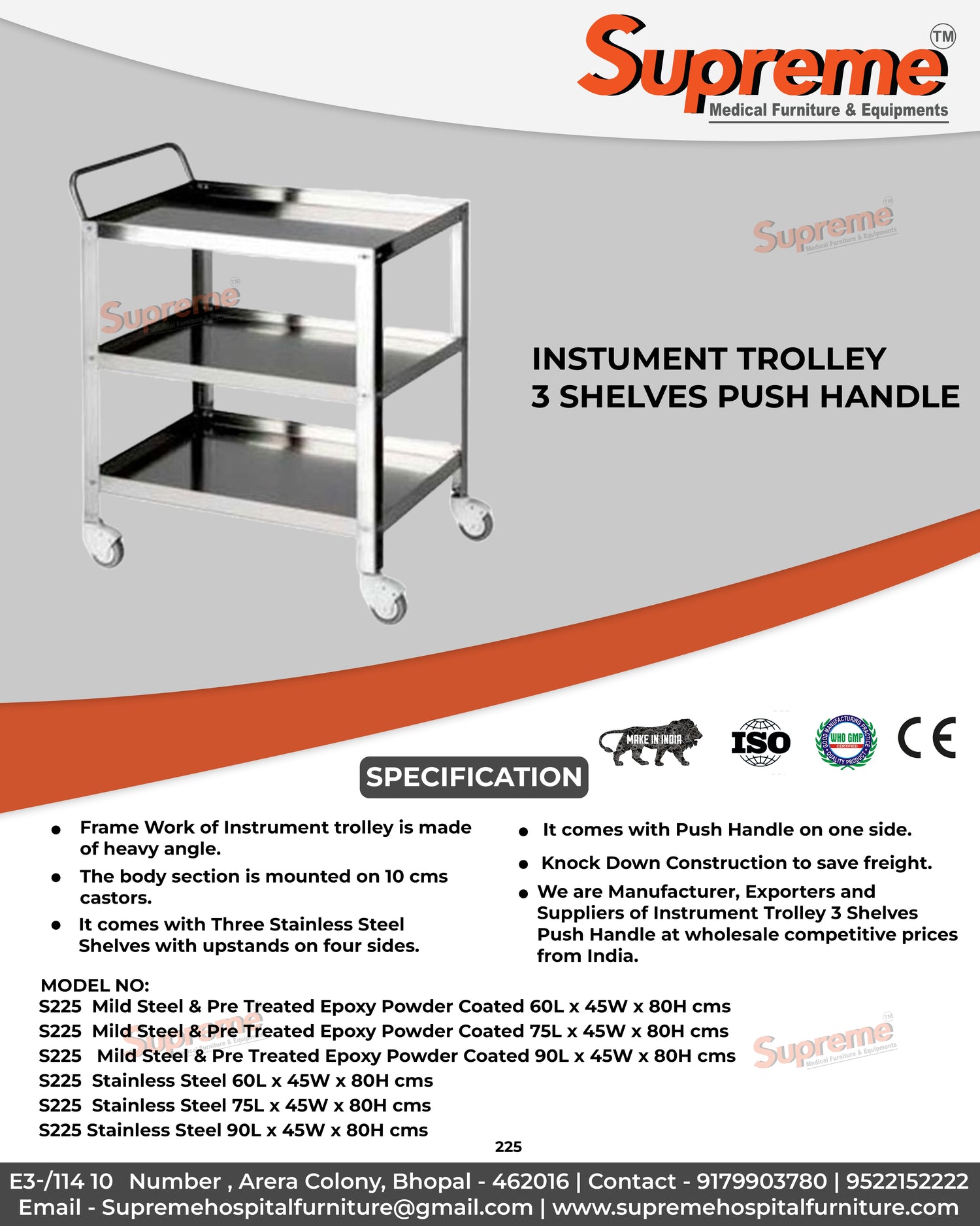 INSTRUMENT TROLLEY 3 SHELVES PUSH HANDLE