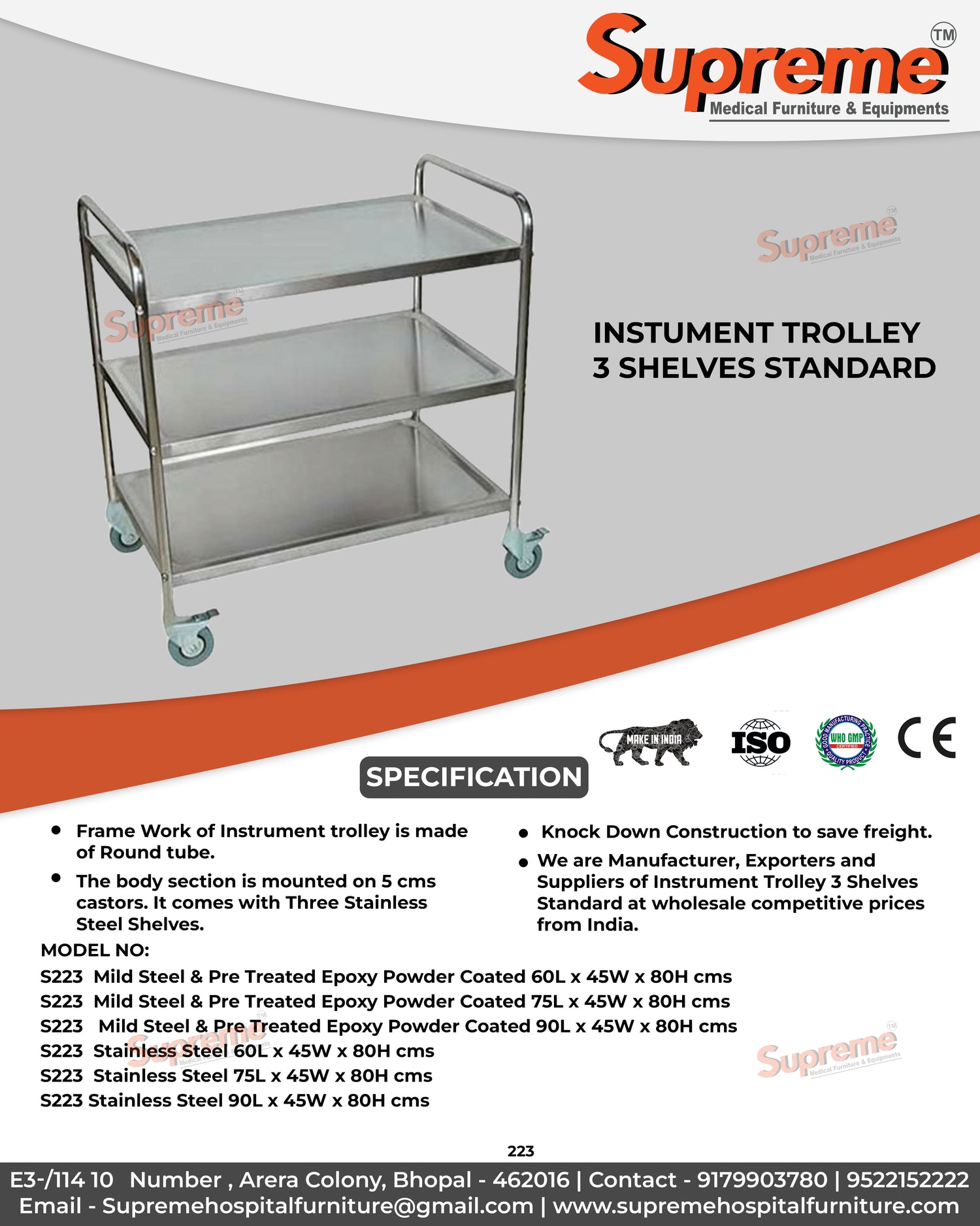 INSTRUMENT TROLLEY 3 SHELVES STANDARD