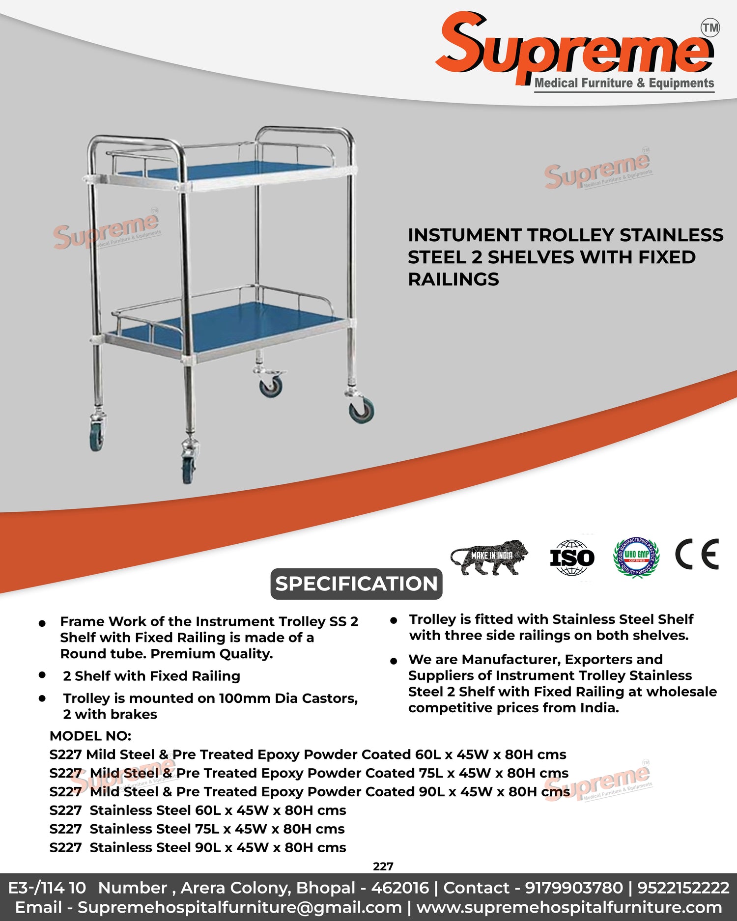 INSTRUMENT TROLLEY STAINLESS STEEL 2 SHELVES WITH FIXED RAILINGS