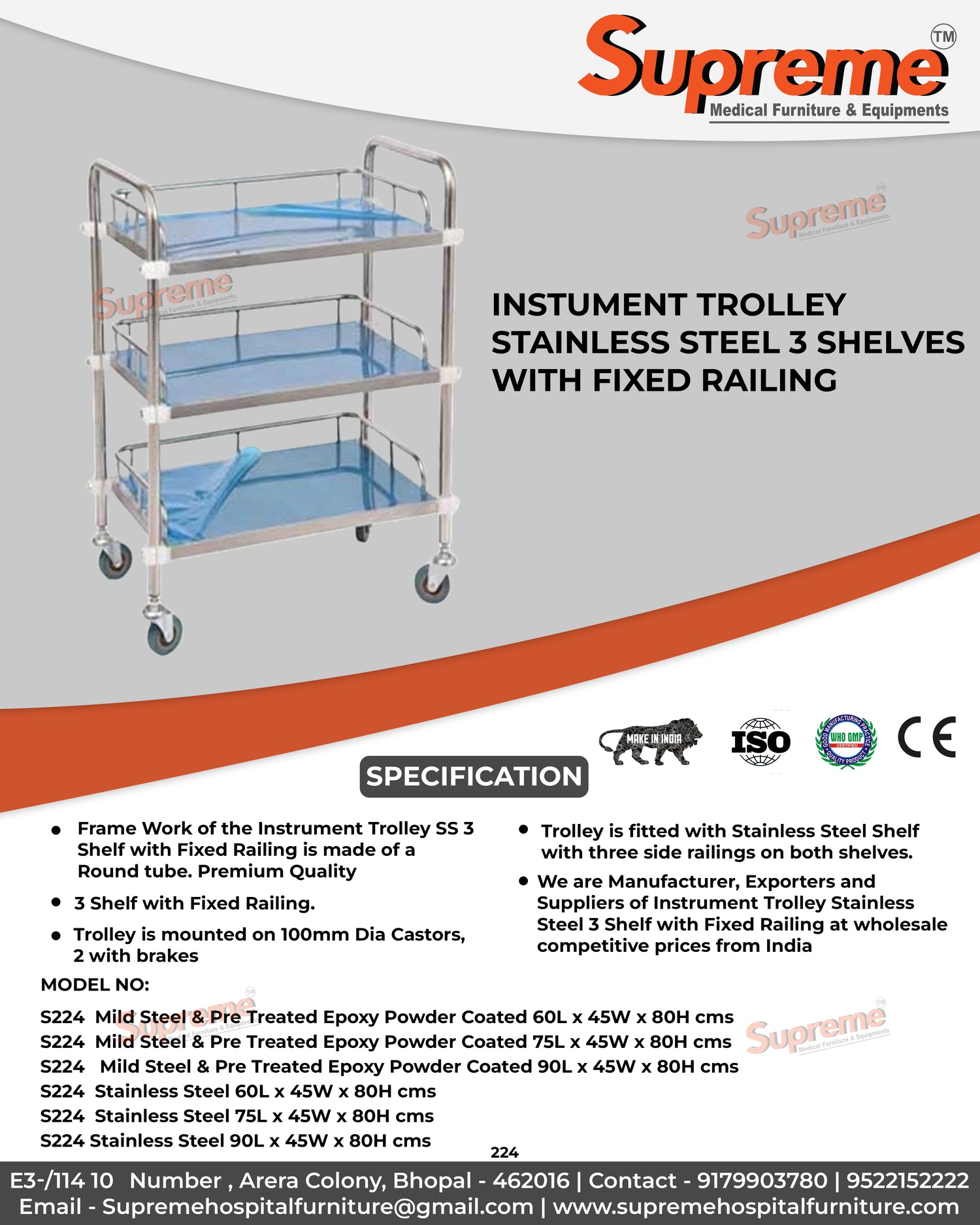 INSTRUMENT TROLLEY STAINLESS STEEL 3 SHELVES WITH FIXED RAILING